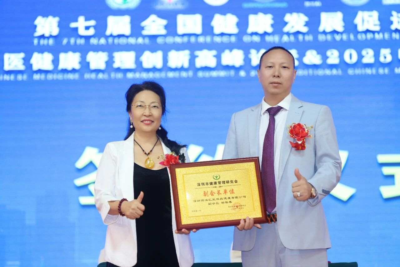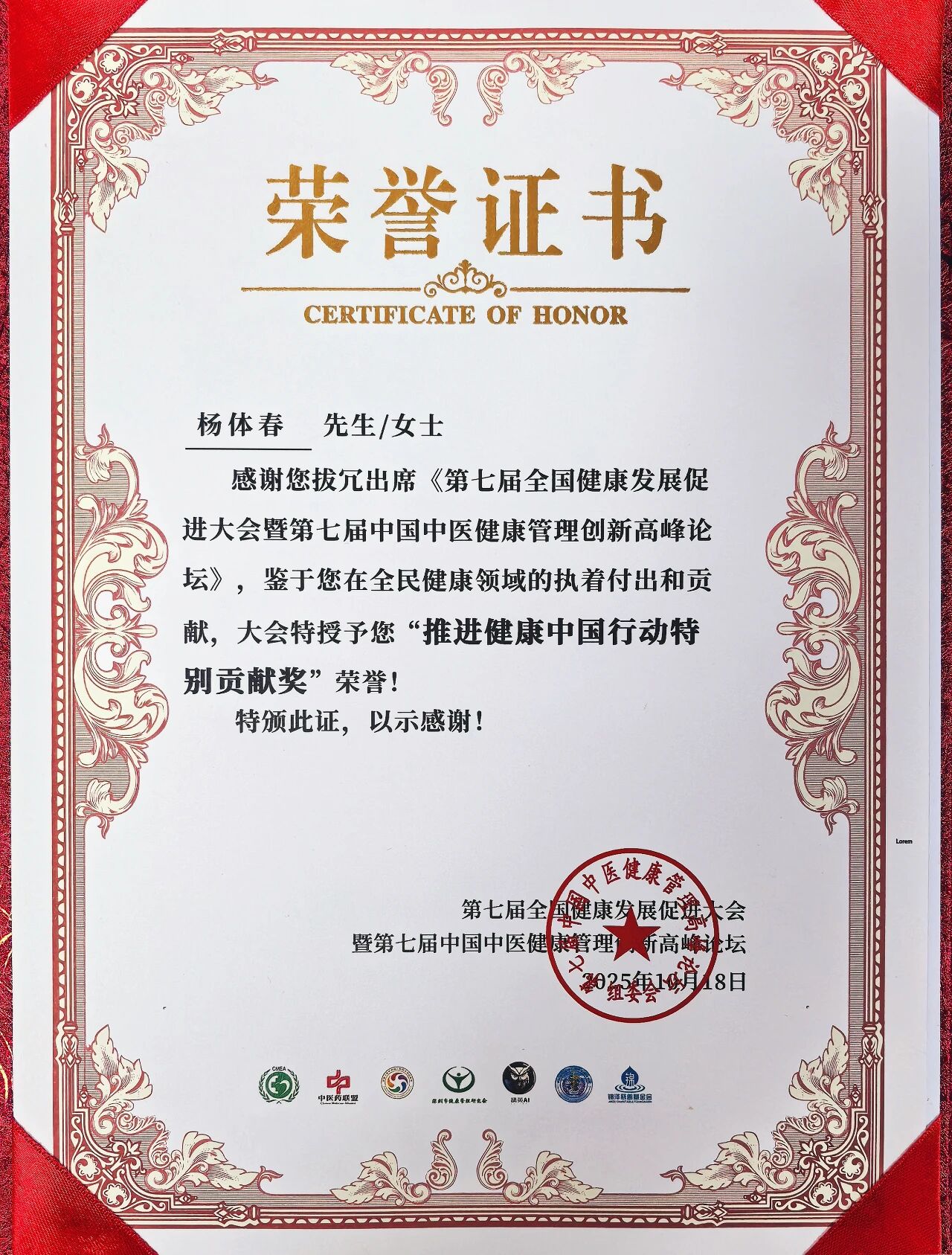 双喜临门的是,在“第七届全国健康发展促进大会” 这一重量级健康领域盛会中,杨体春先生再获重磅认可 —— 一举斩获“推进健康中国行动特别贡献奖”与“中医传承榜样人物”两项重量级荣誉。其中,“推进健康中国行动特别贡献奖”是对其在践行“健康中国”战略中,推动健康科技成果转化、服务全民健康的突出贡献的权威肯定;“中医传承榜样人物”则彰显其在传承中医精华、推动中西医结合健康服务创新方面的深厚积淀与行业标杆地位。